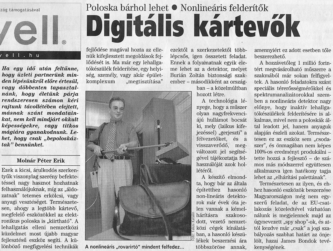 A hozzávetőleg 1 millió forintért megvásárolható műszerre a szakmából már sokan felfigyeltek. A hasonló feladatokra szánt speciális térerősségmérőkkel és spektrumanalizátorokkal szemben a nonlineáris detektor nagy előnye, hogy inaktív lehallgatókészülékek felderítésére is alkalmas, mivel nem a poloskák által leadott jel, hanem anyaguk alapján észleli azokat. Természetesen ez az eszköz sem „csodaszer", és önmagában nem képes 100%-os eredményt produkálni — tette hozzá a fejlesztő — de számos más módszerrel együttesen alkalmazva igen hatékony tagja lehet az „elhárítási palettának".